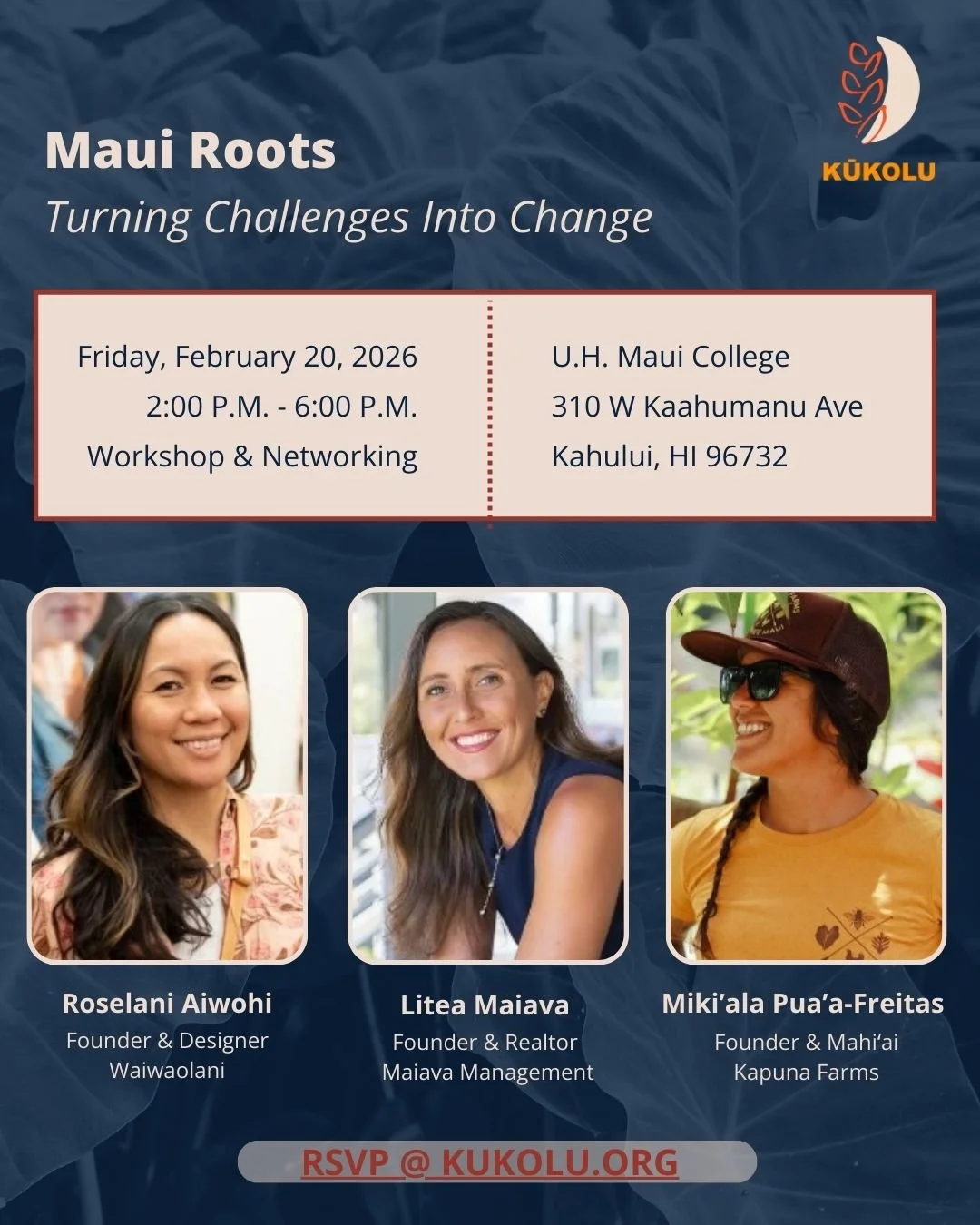 Join us for a community workshop with Roselani Aiwohi, Litea Maiava, and Miki’ala Pua’a-Freitas, networking to follow. Click below to RSVP